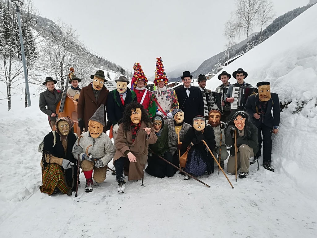 DER "MATACINCH” VON LASTE: eine andere traditionelle Maske von dieser Zone ist der “Matacinch” von Laste (Rocca Pietore). Es trägt Zeichen von Überfluss auf seiner Kopfbedeckung, die geformt wie eine Mitra ist, und auf der er die Familienschmuck und die Federn des Birkhuhns, Symbol von Fruchtbarkeit, ausstellt. Er geht, mit seinem Lacchè (seinem Diener), von Haus zu Haus, und er lad die Mädchen zum Ball ein. Er lässt dem Vater der junge Frauen einen Pfand und er ist verantwortlich für ihre Sicherheit. Er trägt die Zeichen des Wiederauflebens: das Zepter oder den geblümten Zweig, die Kuhglocken, die Bänder, und die bunte Tücher. Der Lacchè ist wie der Matacinch angezogen, aber er trägt ein flaches Tuch auf dem Kopf.