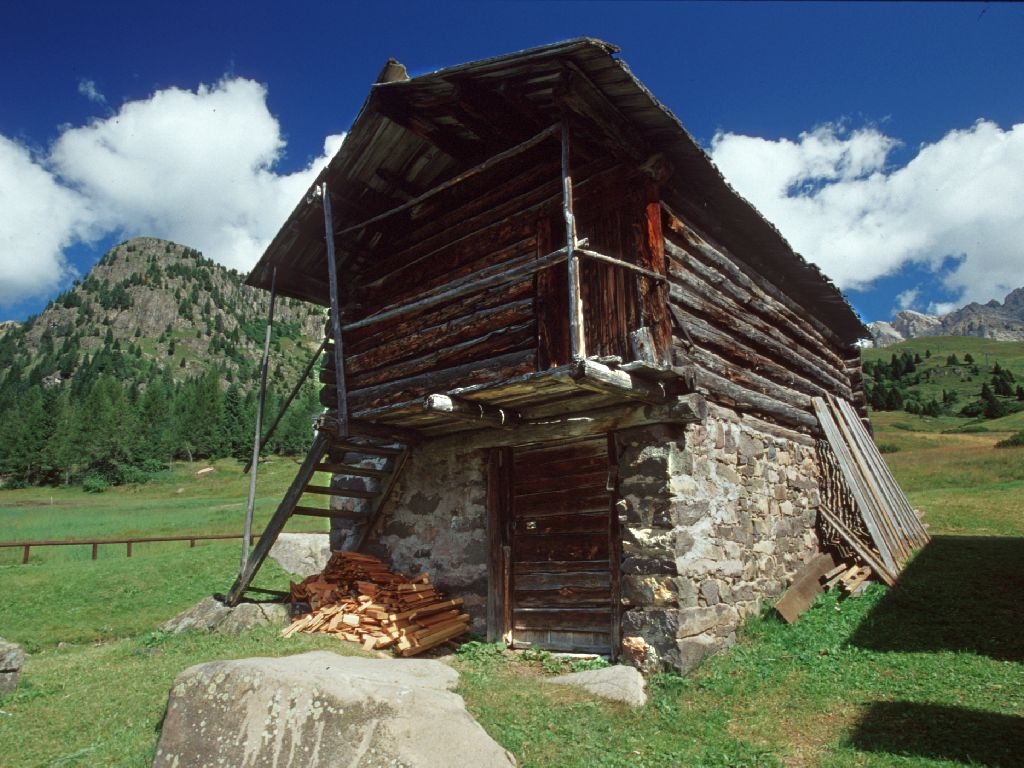 On the front side of each barn, on the roof girder there is the date of construction, and, sometimes, if the dates are more than one, there are also shown the dates of the subsequent restorations. The tabià are located in the sunbathed and privileged locations on the mountains' slopes or in the villages center. Their architecture gives us more information about the construction period: the oldest have horizontal beams, according to a method of construction known as "bunk"; one of them at the top is dated 1665. Starting from 'nineteenth century a new architectural style appears, it is called "a Kolondiei". With the spread of hydraulic sawmills and the evolution of the technique of wood manufacturing, its value increased and it was the need to use it less. Thus to this end the inhabitants developed the system of construction in columns (in Kolondiei), which, while ensuring a hay drying space on the three sides of the building, allows to save on the amount of timber. At first, barns "Kolondiei" style had only one floor, then the more recent ones were built on two floors, sometimes enclosed by a plank. The passage of air is ensured by artistic forms' holes: flowers, clovers, hearts.
